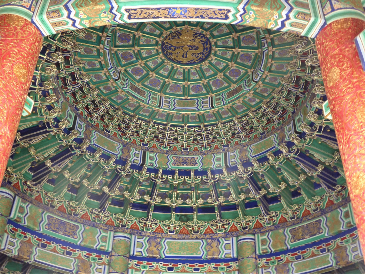 祈年殿と比べるとかなり小さな建物ですが、天井の藻井は見劣りせず、かなり立派です。さらに祈念殿よりは人も少なめなので、じっくり見られるのもいいです。