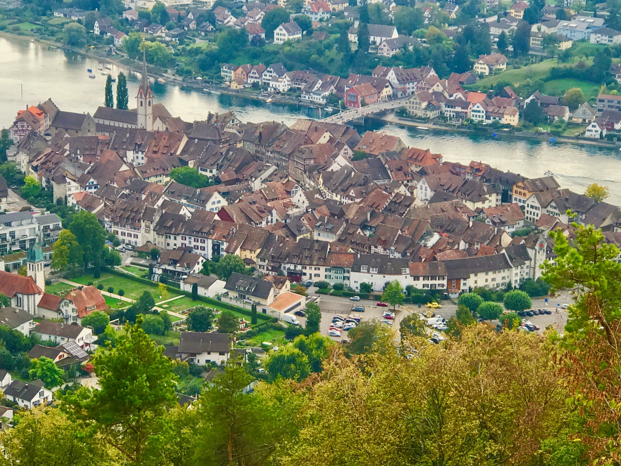 上から街を見下ろすと、川沿いに赤い屋根の家が密集している、円形のシュタイン・アム・ラインの街並みの特徴がよくわかりました
