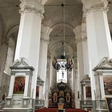ヴィリニュスの旧市街の入口の夜明けの門をくぐると右手に聖テレサ教会、その先にピンクの聖霊教会、その先にこの聖三位一体教会がありました。黄色の門をくぐって今来た道を逆側に少し坂を登ったところに教会がありました。教会内はとてもシンプルな感じですが、祭壇は立派でした。