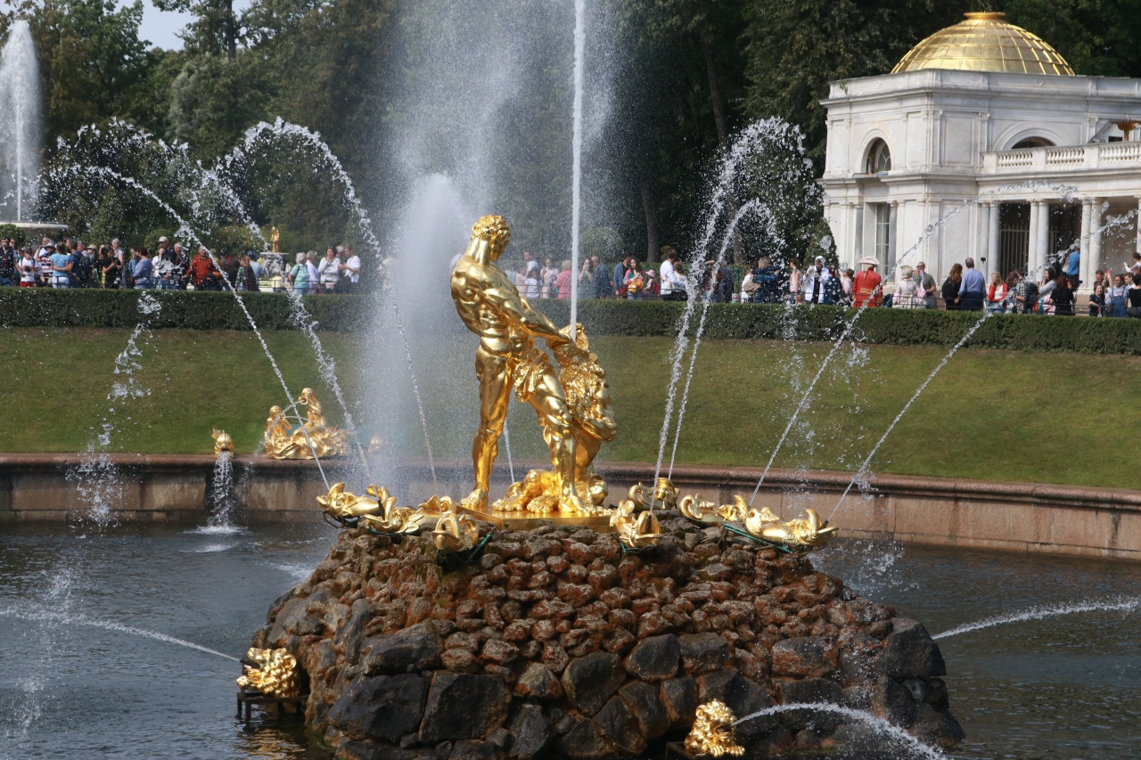 現地ツアーで行きました。ペテルゴフ宮殿の前にある有名な噴水の一番下にあります。黄金の像で、像自体も噴水になっています。噴水の水がかかると、サムソン像の黄金がさらに輝きがまして、より荘厳に見えるようになりました。