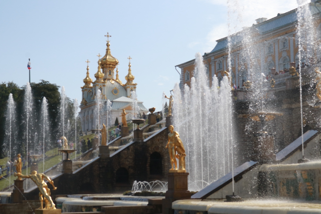 現地ツアーで行きました。ペテルゴフ宮殿の有名な噴水の一部になります。宮殿と庭園の間が段差になっており、その段差の傾斜を利用して階段状の噴水が設置されています。大滝の噴水の周囲には、黄金の像を設置されていて、絢爛豪華な噴水になっております。