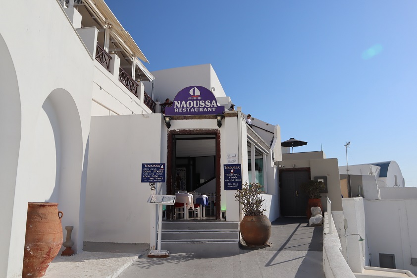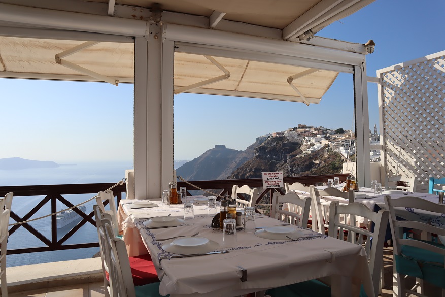ホテルのフロントのお勧めで、フィラの崖の上に建つこのレストランに行きました。大聖堂のすぐ近く。崖の上に建っているので、テーブル席からの眺めはみごと。また、家庭的なギリシャ料理も絶品でした。二人でおなか一杯に食べて60ユーロとリーズナブル。眺めの良いレストランはそれなりの値段がしましたが、3日間のサントリーニ島の滞在中、このレストランが、眺め、味、値段ともにベストでした。