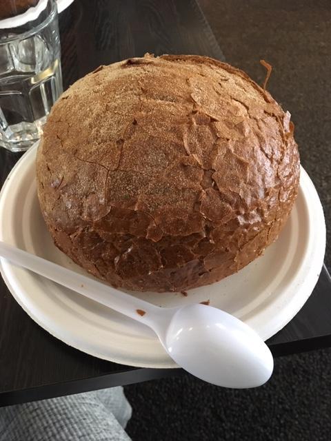 大きなパンをくり抜いた中に具材たっぷりの料理が入ったものが食べられます。