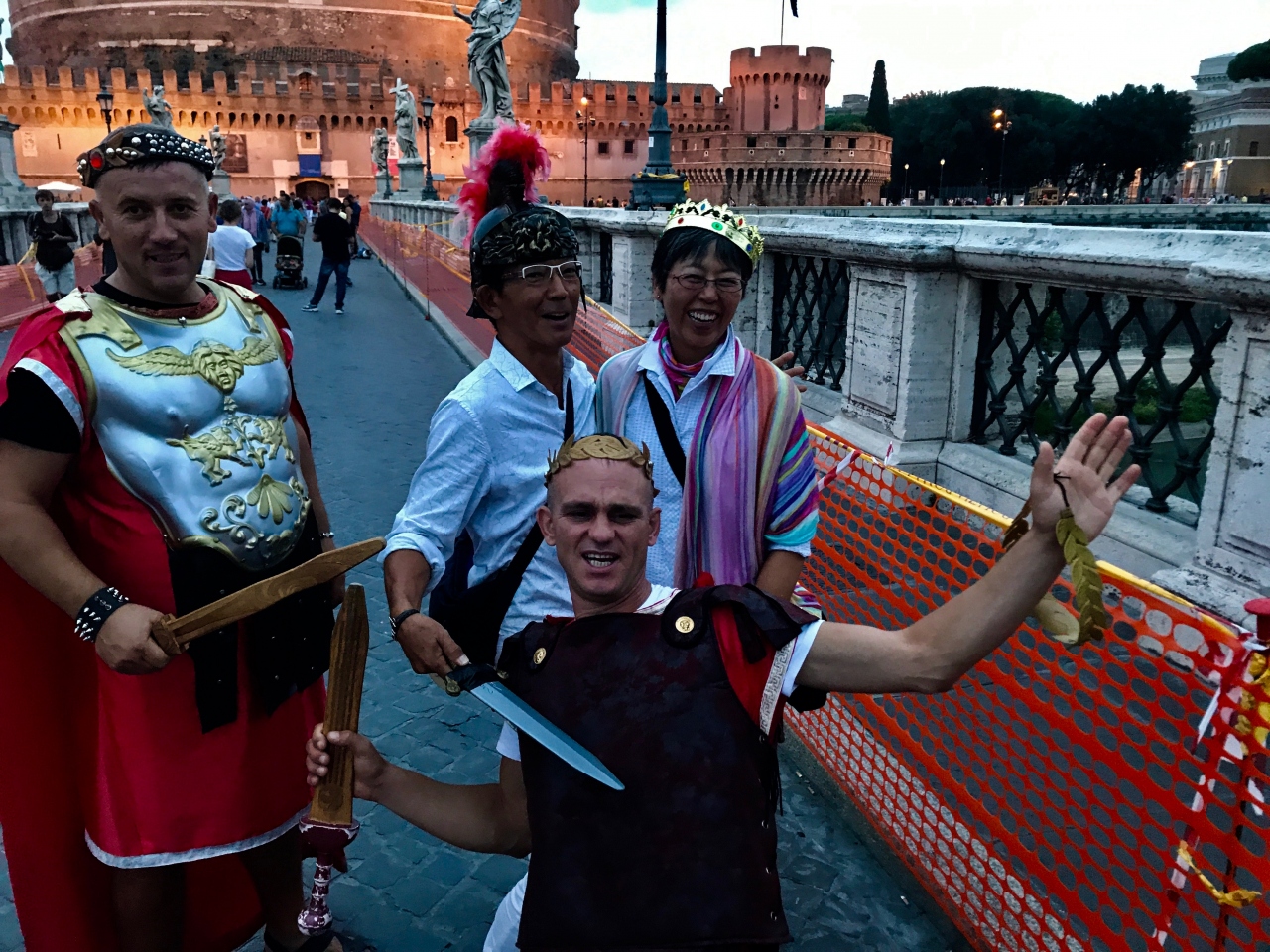 バス停から橋を渡っていく時に、3人組がローマ時代の衣装を着ていたので写真を写していると、「これを持て」と言って剣を渡されたり帽子をかぶらされたり、色々とポーズをとったりとらされたりで写真を撮ってくれました