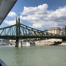 ドナウ川クルーズでこの橋を知りました。スタートして国会議事堂の方へ向かい、マルギット島の前でUターンして、セーチェニ鎖橋、エルジェーベト橋をくぐったその先にこの自由橋でした。エルジェーベト橋は白い華奢な感じの美しい橋でしたが、この自由橋はゴツゴツした感じの鉄橋で頑丈な感じを受けました。