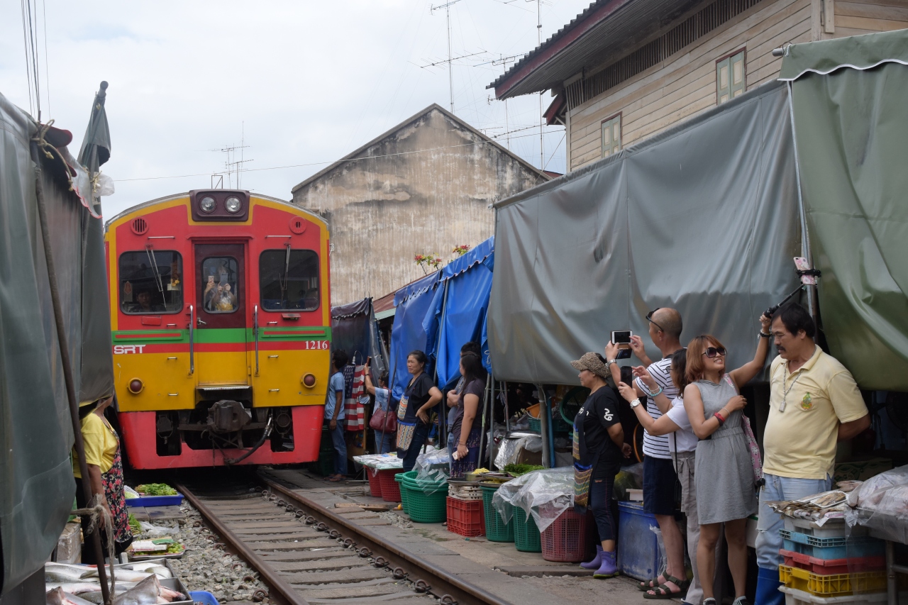 前から一度いってみたかったのですがなかなか遠くいく機会がなく、今回ようやくいけました。最初にバンコクのウォンウィエンヤイ駅からローカル線で一時間、マハ―チャイで川を越えて乗り換えさらに一時間で到着します。最後メークローン到着前にゆっくりと市場の中を通りますが、その時車内からもカメラを構えてとれますし、外からもすれすれを走り去る列車を写真に収めることもできます。行きは列車の中から顔を突き出し、下でカメラを持っている人に手を振ったりハイタッチをしたりと普段ないような経験でとても楽しかったです。すべての交通費を合わせて60から70バーツほどとかなり安いですが四時間かかりました。