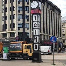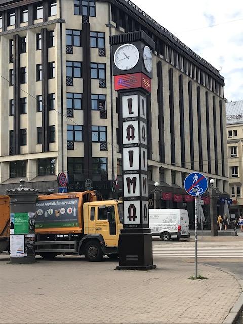 リガの旧市街から新市街へ行くにはいくつかの橋がありますが、自由記念碑のある道が一番広くて賑やかではないでしょうか。旧市街側にこの時計台が建っています。そんなに大きなものではないですが、独特のデザインで目立ちます。Laima はチョコレート屋さんです。