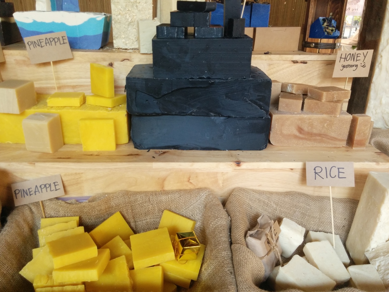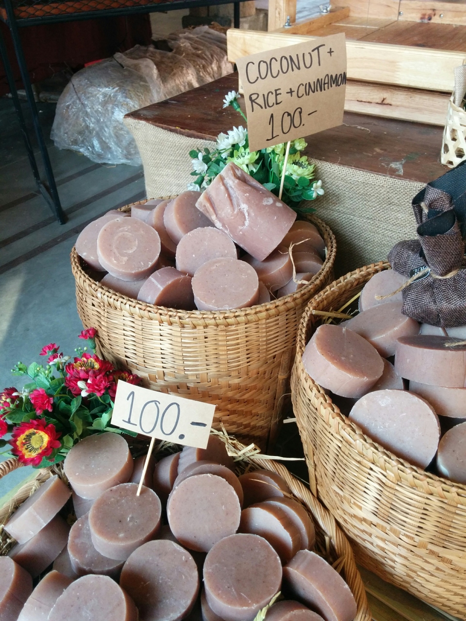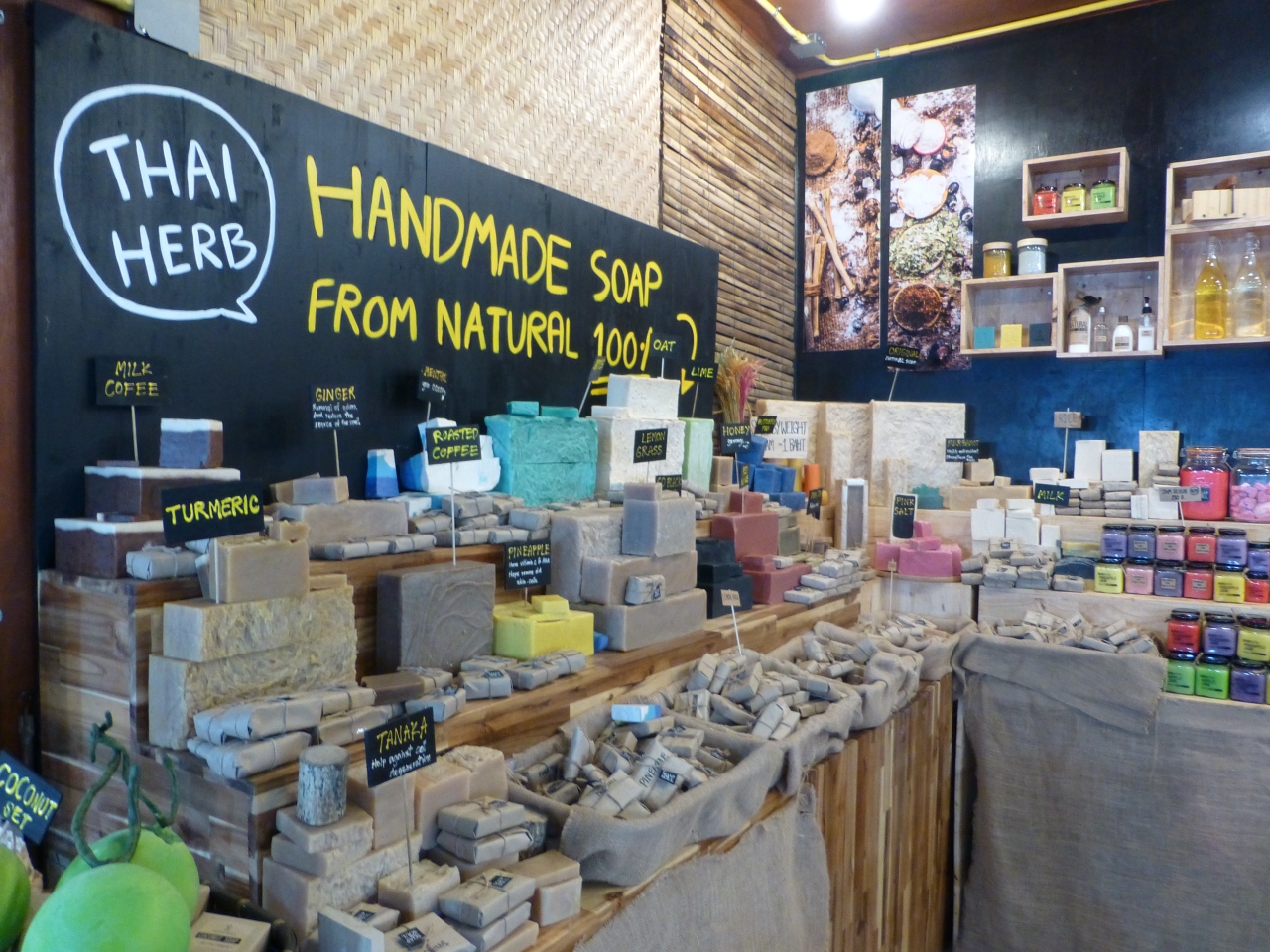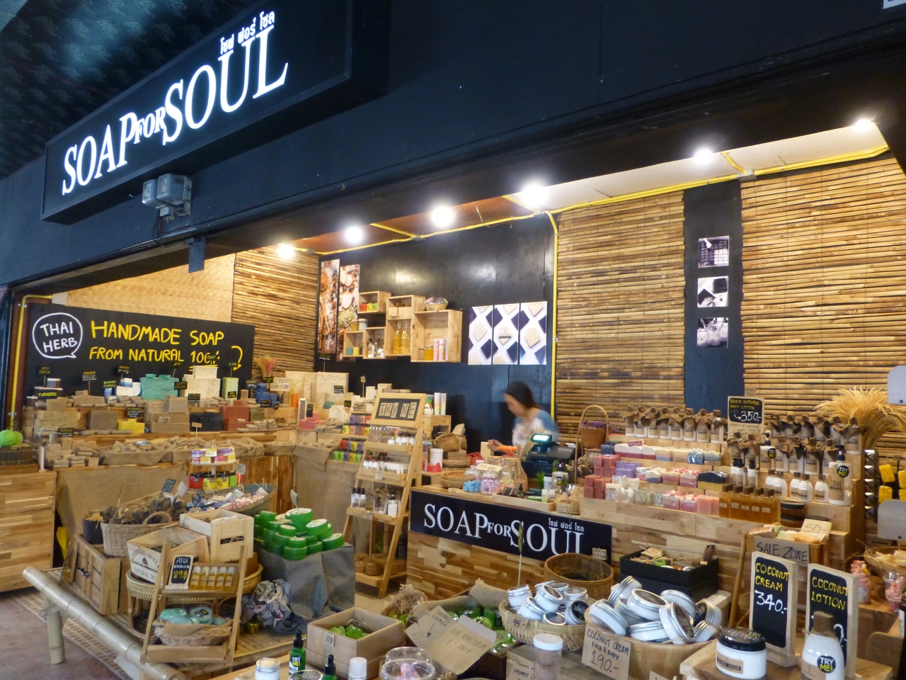 市場のオープンは18:00位からと聞いていたのに、日曜の19:00頃に行きましたが、オープンしている店は3割位。客もほぼいません。遅い時間に行ったことがないので分かりませんが、来たことをガッカリする位、店が開いてません。ただ、私の目的は手作り石けんのお店(Soap for Soul)のみでしたので、開いていてホッとしました。ニマンへミンのOneニマンにもポップアップショップはありますが、種類が少く、今回は本店?のこちらへ来てみました。確かに種類はとてもたくさんあります。目的の手作り石けん(1g=1バーツの量り売り)を大量に購入。とても香り高く、使い心地がよいので、普段、ラッシュの量り売り石けんを愛用している方ならオススメです。バタフライピーやレモングラスなどバスルームに置いているだけで香りに癒やされます。タイミングが良いと、お得な切り落としなどもあります。