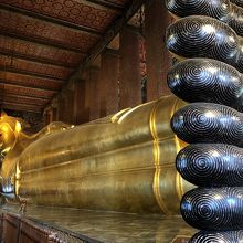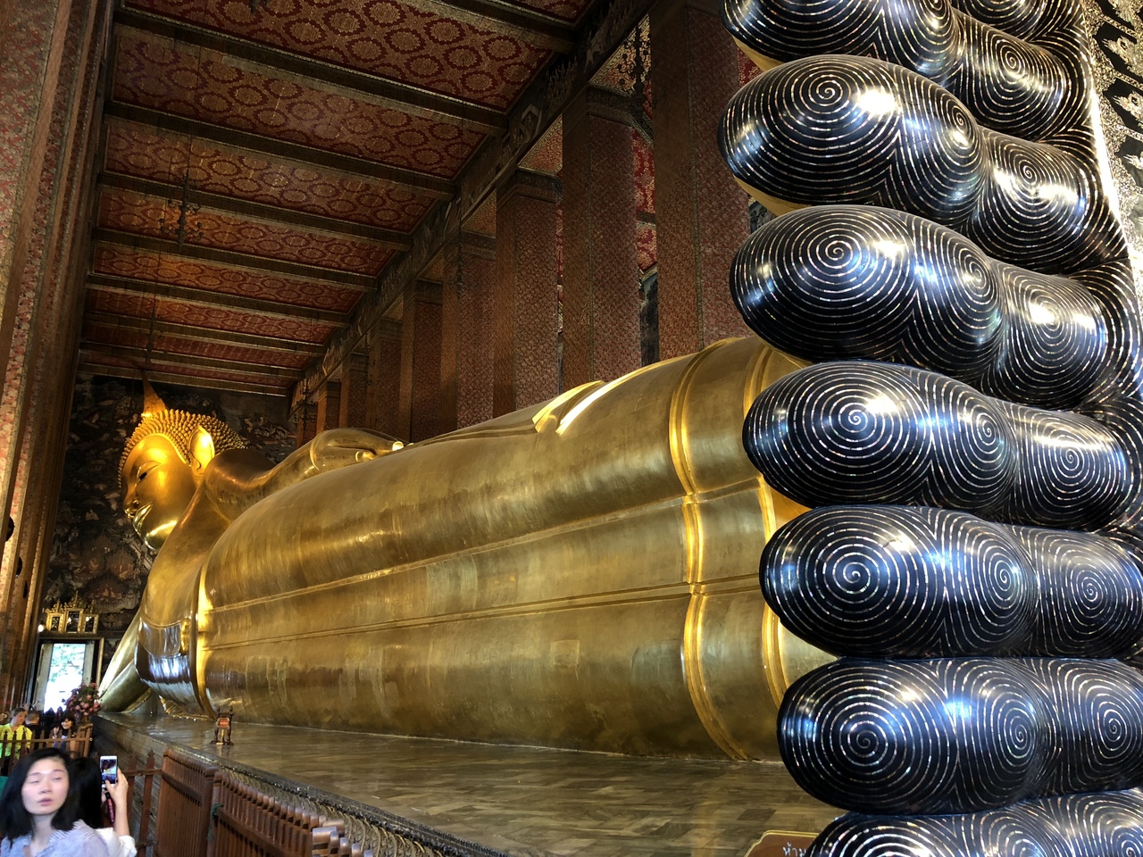 金色の涅槃像はワットポーのシンボル。足の裏には仏教の世界観を表した図がびっしり描かれております。写真を撮る人も非常に多い、まさに世界一有名なごろ寝おじさんです。