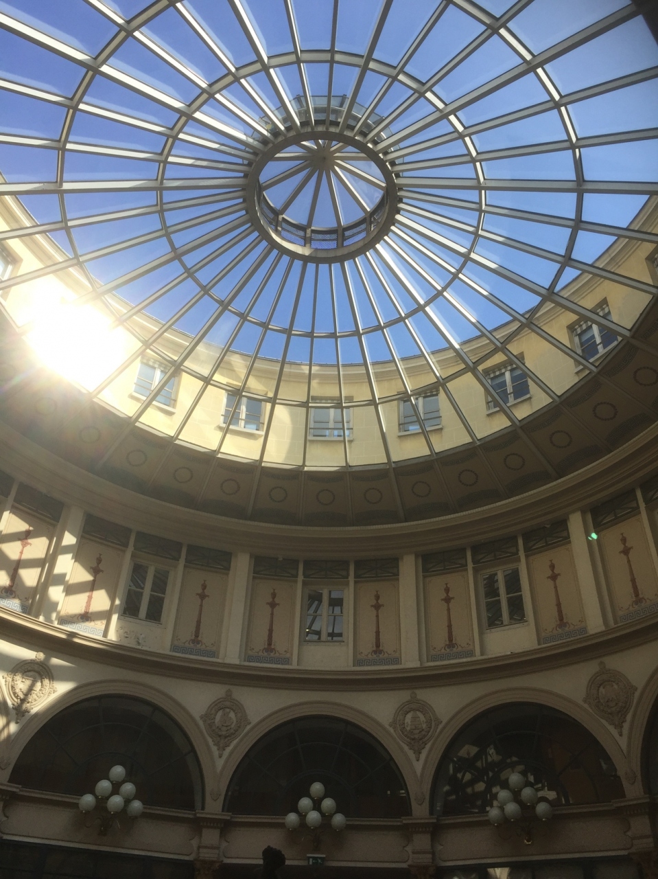 パレ・ロワイヤルの近くにあります。入り口に怖そうな門番がいて、荷物の中をチェックされました。商店街に入るのに、何故?という感じでした。中に入ると、とても大きなドーム天井があり、そこは素晴らしい感じました。