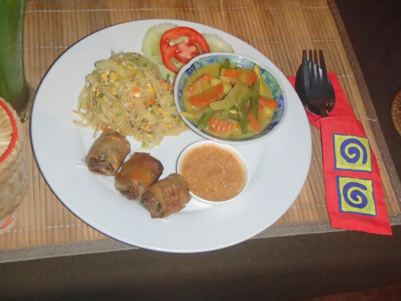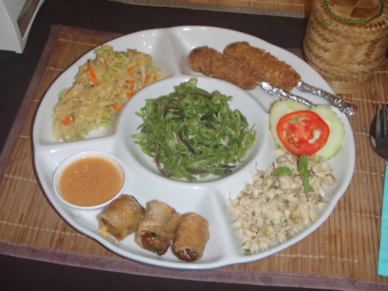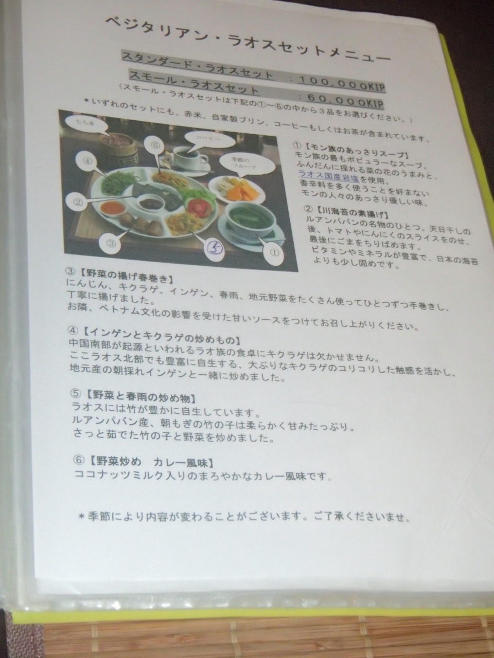 私は「シェフのおすすめセット」、妻は「ベジタリアンスモールセット」をオーダーしました。通常のセットは100,000キップ(約1250円)、スモールセットは60,000キップ(約750円)でした。