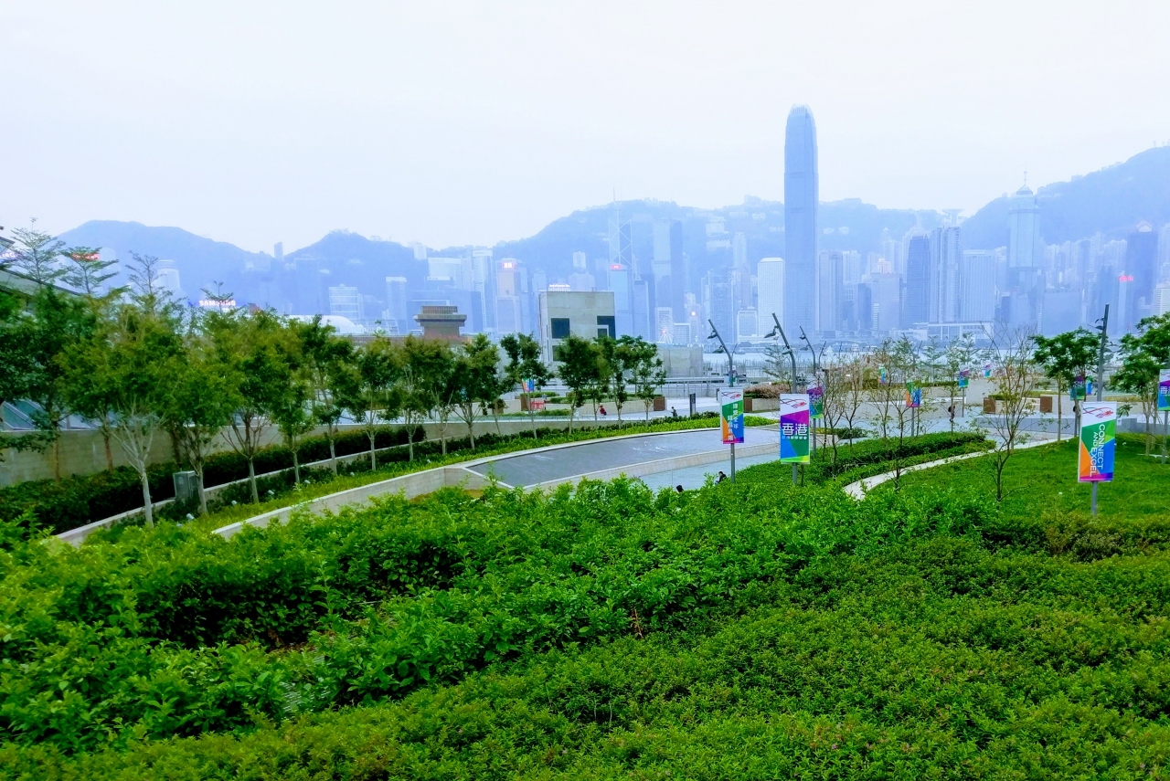 九龍駅と柯士甸駅の間で、どちらからでも同じくらいのアクセス距離ですが、九龍駅からの方が坂を上がったりしなくて良いので楽な気がします。駅の屋上は「緑化空間」という名の屋上庭園になっていて、香港サイドを眺めることもできました。