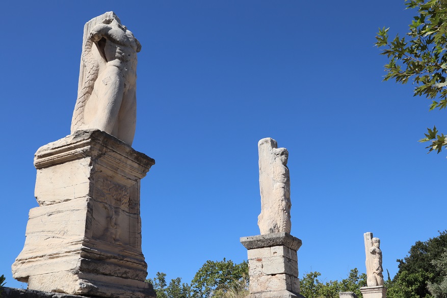 古代アゴラの入口近くに、この人の形のデザインのユニークな柱が3本並んであります。入口から、ヘファイストス神殿へ向かう通り道です。柱の奥に向かっては、廊下というか広間のようなスペースが広がっていて、当時の姿を想像できます。