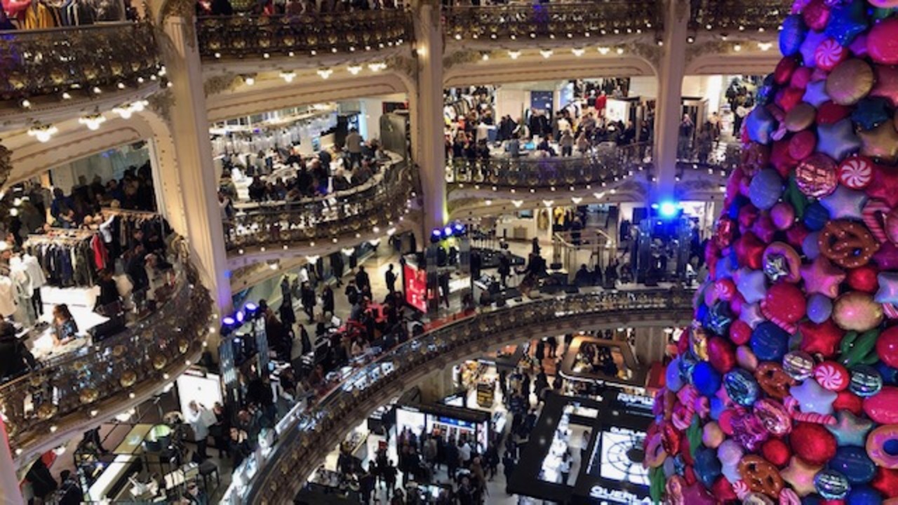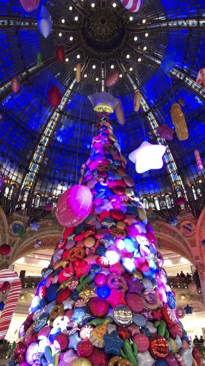 中心の吹き抜けには天井に届きそうな巨大なツリー、ピンク色や紫色のライティング、日本の百貨店にはない演出です。