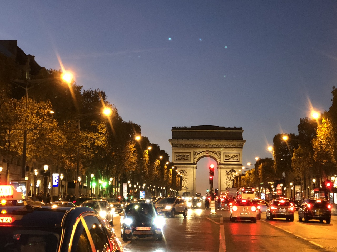 シャンゼリゼ通りで友人と待ち合わせて夕食をいただいた後、ぶらぶらと歩いてライトアップされた凱旋門を見に行きました。