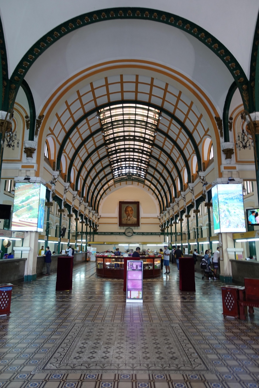 ドンコイ通りの突き当りにある郵便局。アーチ形とガラスの天井が美しく,タイルの床もとってもかわいいです。お土産物もたくさんあって,特に可愛い切手がたくさんありました。無料で入場できるし,一度は訪れたい場所です。