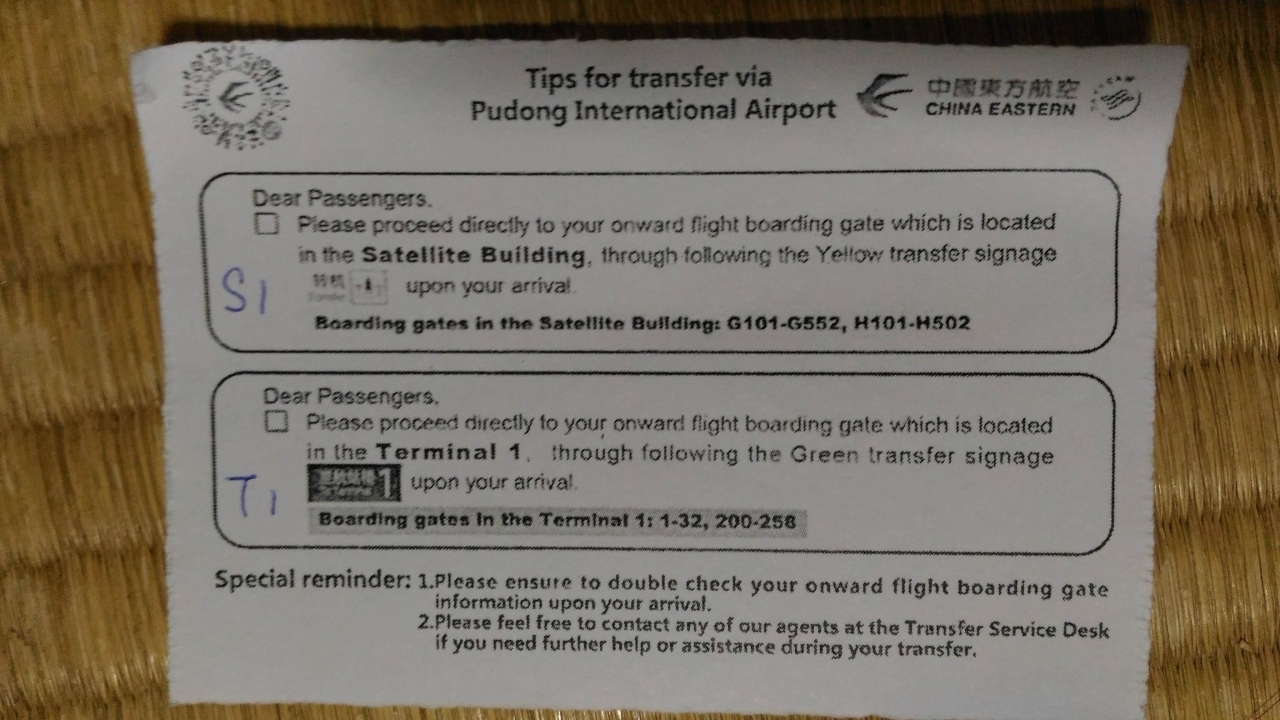 シンガポールの空港でスルーチェックインしてその際にPVGでの英語の乗り継ぎ案内メモを渡された。