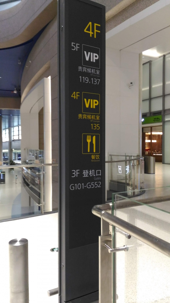 プライオリティーパス利用のラウンジは4階135番とのこと、行ってみると135Aは閉まっていて、135BではPPカードのリーダーがオープン2日目でまだ利用できないので入室できないと断られた。インフォメーションのスタッフも一緒に行ってくれて交渉してくれたが、だめだった。その後、丁寧に謝りの言葉を英語で言ってくれて、さらにスマホで日本語に翻訳してくれて示してくれたのには感激。