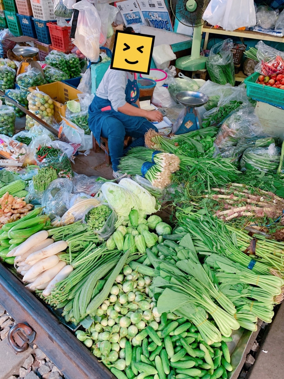 しばらくは線路の脇に位置したお店を見てまわります。ガイドさんが「ここがこの辺だと1番安いお店」と言ってマンゴスチンを買っていました。25THBと書いてありましたが、どのくらいの量でその値段なのかはわかりませんでした。色鮮やかなフルーツは見ているだけで楽しいです。あと青々とした野菜が高く積まれている光景も美しかったです。生活に必要なものが売っているという印象が強く、お土産物にはあまり目が行きませんでした。(実際お土産物がどれだけ打っていたのかも謎)