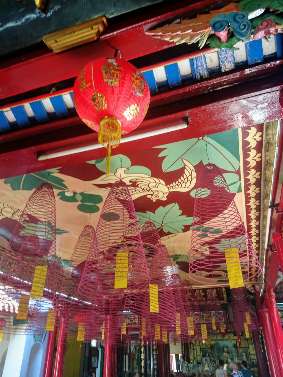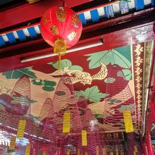 天井からは参拝客が奉納した、大きな螺旋状の線香が吊り下げられています。