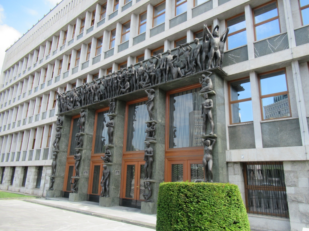 共和国広場の向かいに建つ建物です。シンプルな外観のビルですが、入口部分が特徴的で、つい気になって近づいてしまいました。ドアを囲む太い柱には、人間が何人も連なる彫刻が付いていました。それぞれ姿勢が異なり、いろんな動作をしているので、じっくり観察してしまいました。