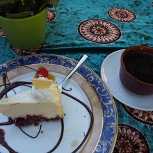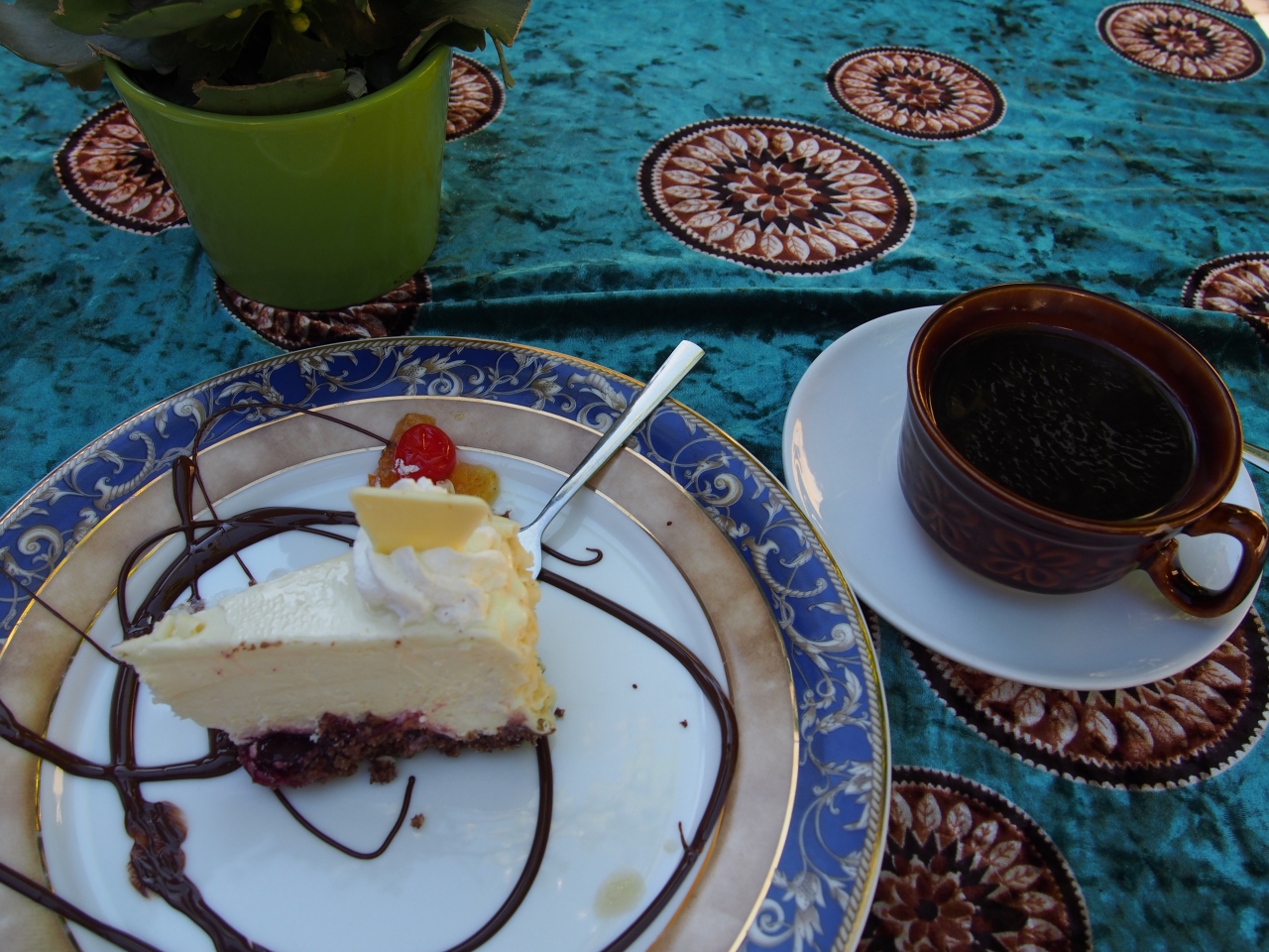 中庭のテラス席でコーヒーとケーキをいただきました。とっても素敵な雰囲気で,テーブルクロスもお皿も可愛く,コーヒーもケーキも美味しく(ケーキはたくさん種類があって迷いました),優雅な時間をお茶の時間を過ごすことができました。