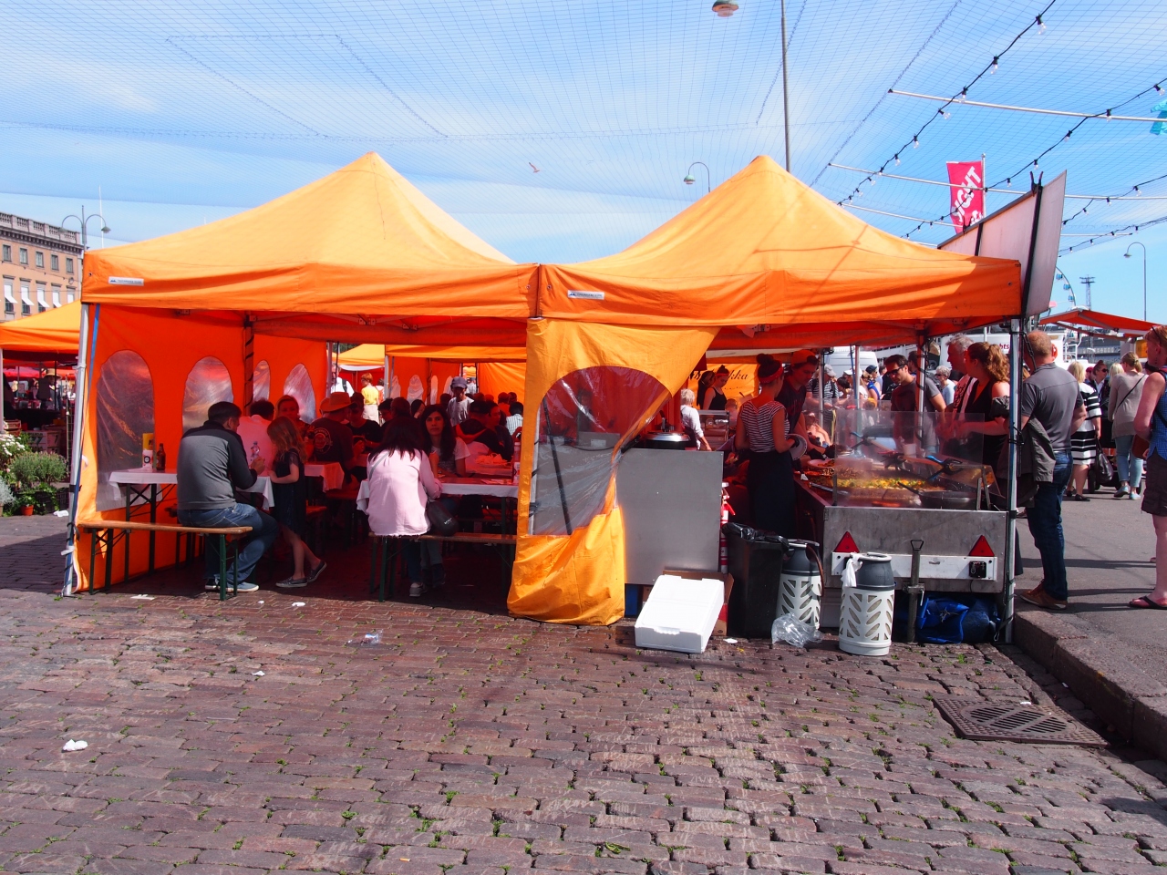 ヘルシンキの港の前,たくさんの屋台が出ています。フィンランド料理,各国料理,野菜や果物などたくさんの物が売られていて,見ているだけで楽しい気持ちになります。たくさんの人が行き交う活気あふれる場所です。