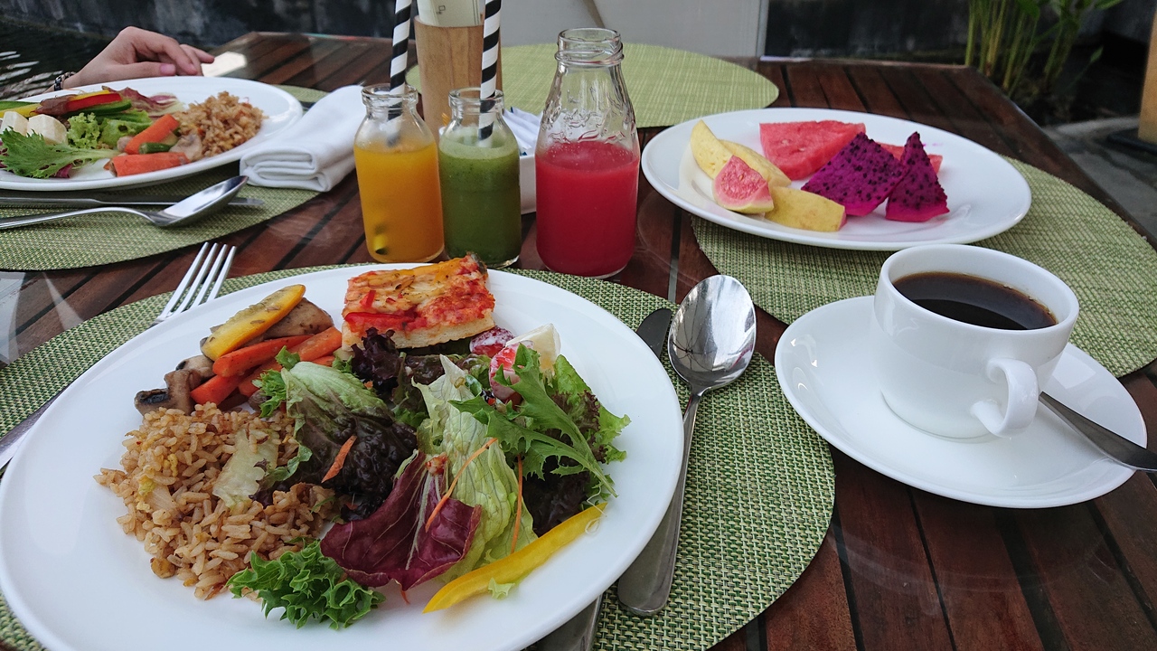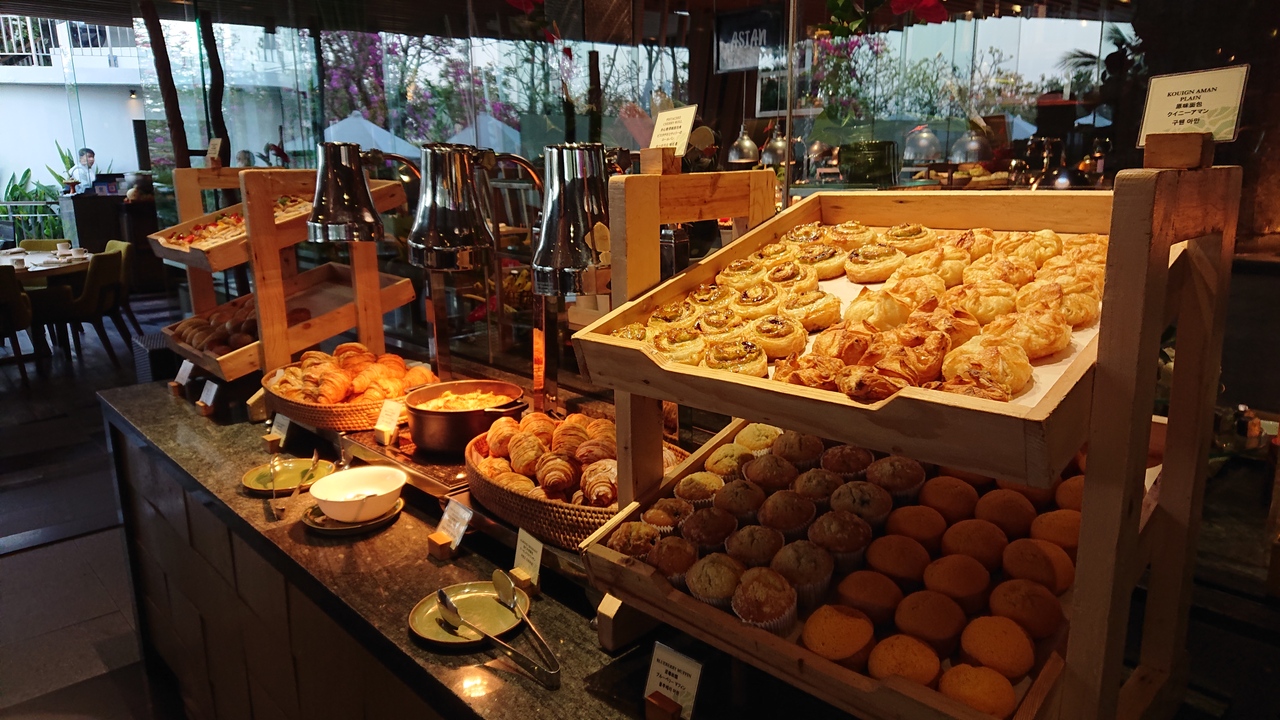 料理は店内のベーカリースペースで作っている焼きたてパン、フルーツ、インターナショナル料理が楽しめますが、去年よりインドネシアン料理が少なくなっていて残念でした。外のテラス席がおすすめです。