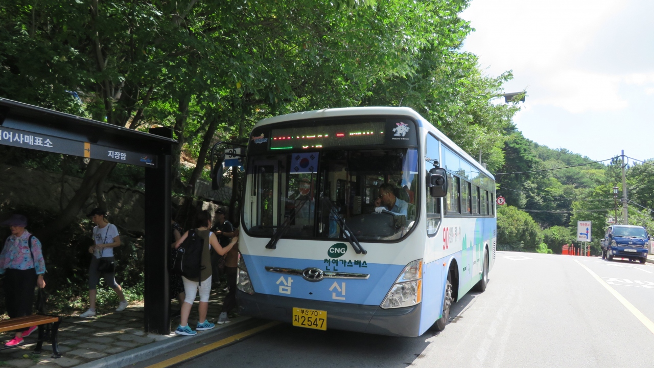 梵魚寺駅の7番出口からすぐに左手に数メートル進むと右手に入る路地があります。その路地は、ちょっと上り坂のような感じでお店やレストランが立ち並んでいます。そこを200mぐらい進むと梵魚寺行きの90番のバス乗り場があります。そこからバスに乗り約15分ぐらいで梵魚寺に到着します。