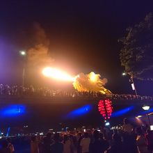 ファイヤーショーは、橋の下から見学しても熱気が伝わります。