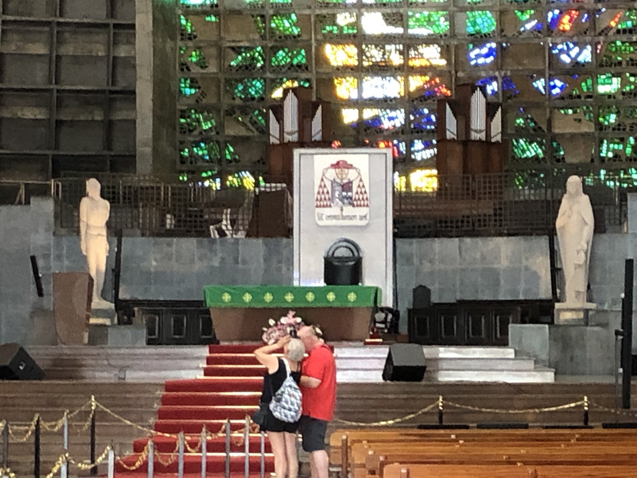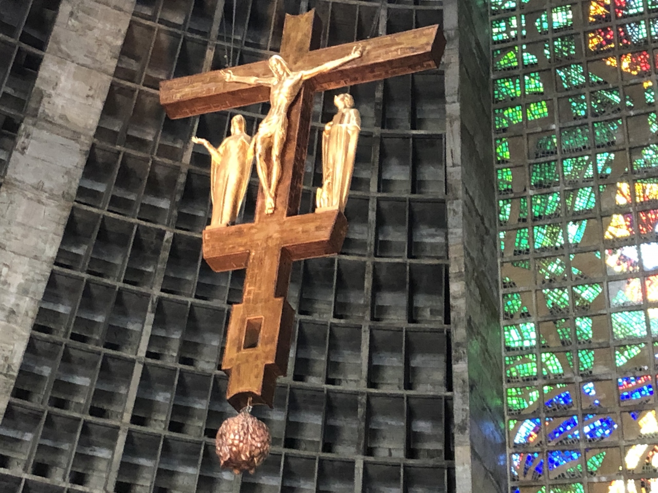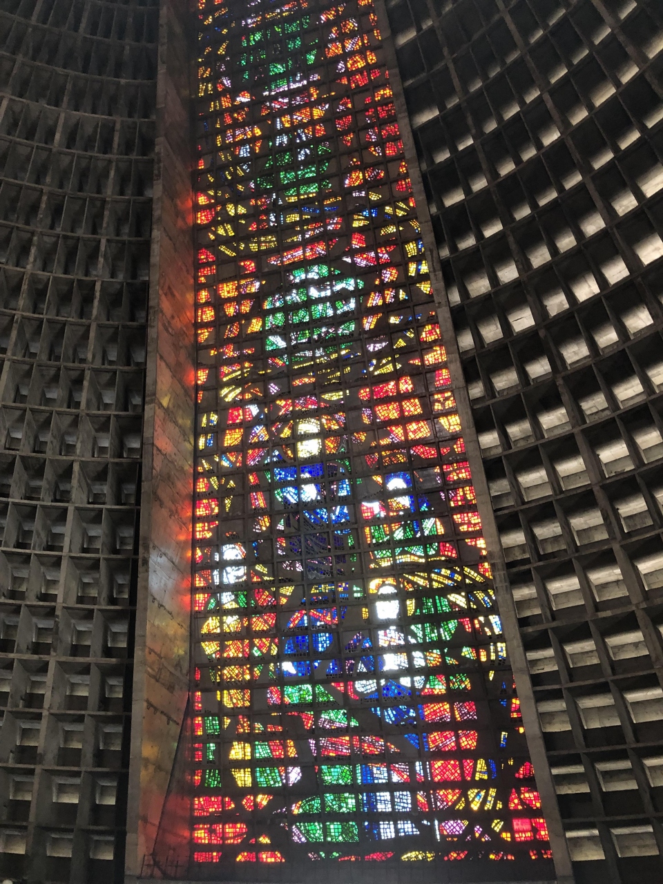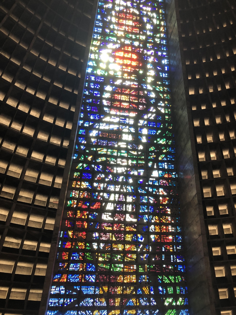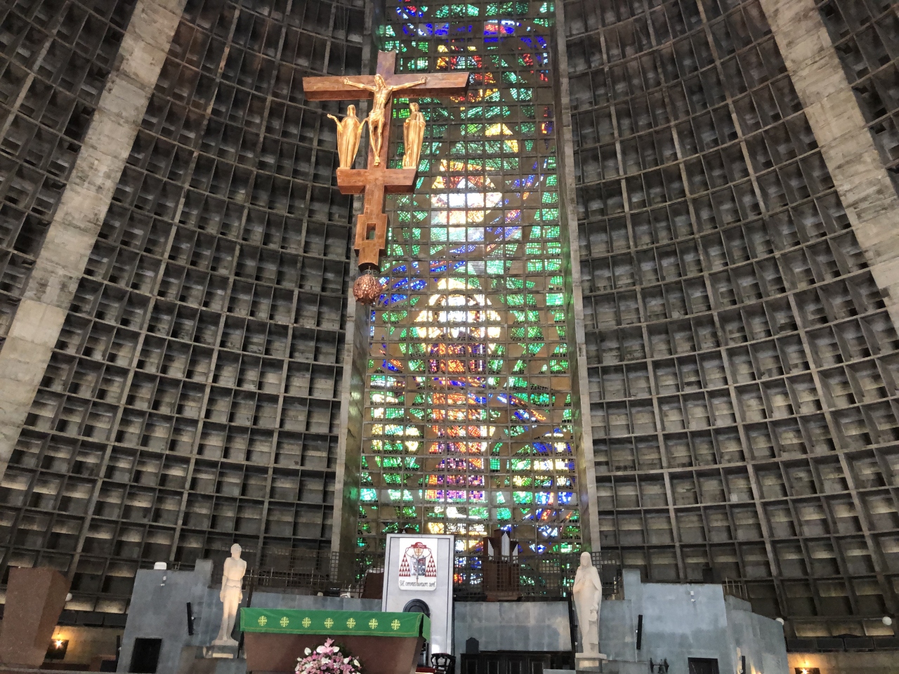 ツアーで訪問しました。ピラミッドのような、円錐型の上部を切り取った形で、高さは80mあります。上部から地面までのステンドグラスが3枚。それぞれ色が違っていて、美しいです。空中に十字架がぶら下がっています。
