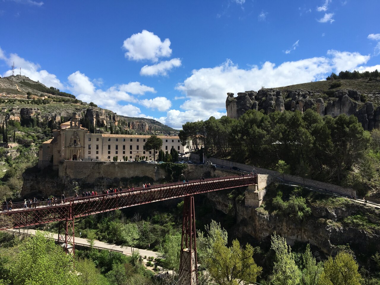 クエンカの旧市街に架かる赤い橋です。宙づりの家のすぐ近くにあり、橋を渡るとパラドールがあります。細くて長い橋です。この橋の上から見る宙づりの家がまた素敵です。夜はライトアップされるので、夜も訪れるといいです。
