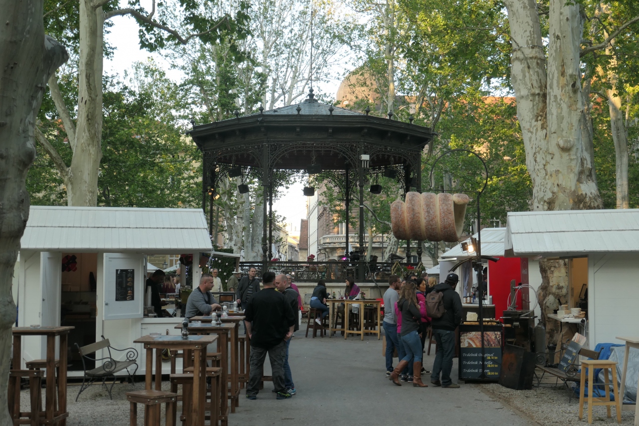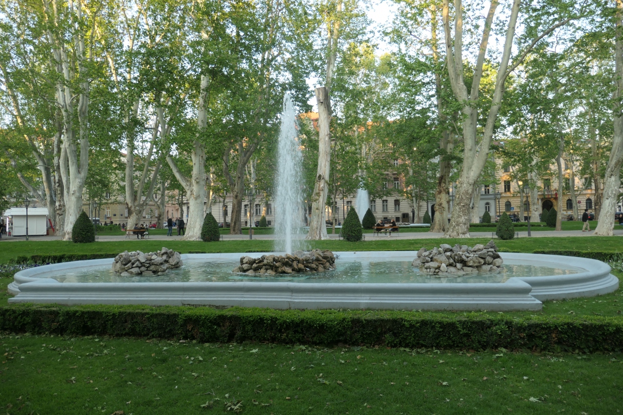 旧市街にあるイエラチッチ広場から南に向かって5分程歩くと、緑の木々が茂る公園がありました。ズリニェヴァツ公園で噴水があり、ザグレブ市民の方々が夕暮れ散歩をされていました。中央部でコンサートが開かれるようで、舞台が準備され、周囲に臨時カフェなども開店準備中でした。この場所からザグレブ駅までの数百メートルは、広大な公園が広がっています。周辺に歴史建造物も多いので、公園に沿ったザグレブ散歩も楽しいと思います。