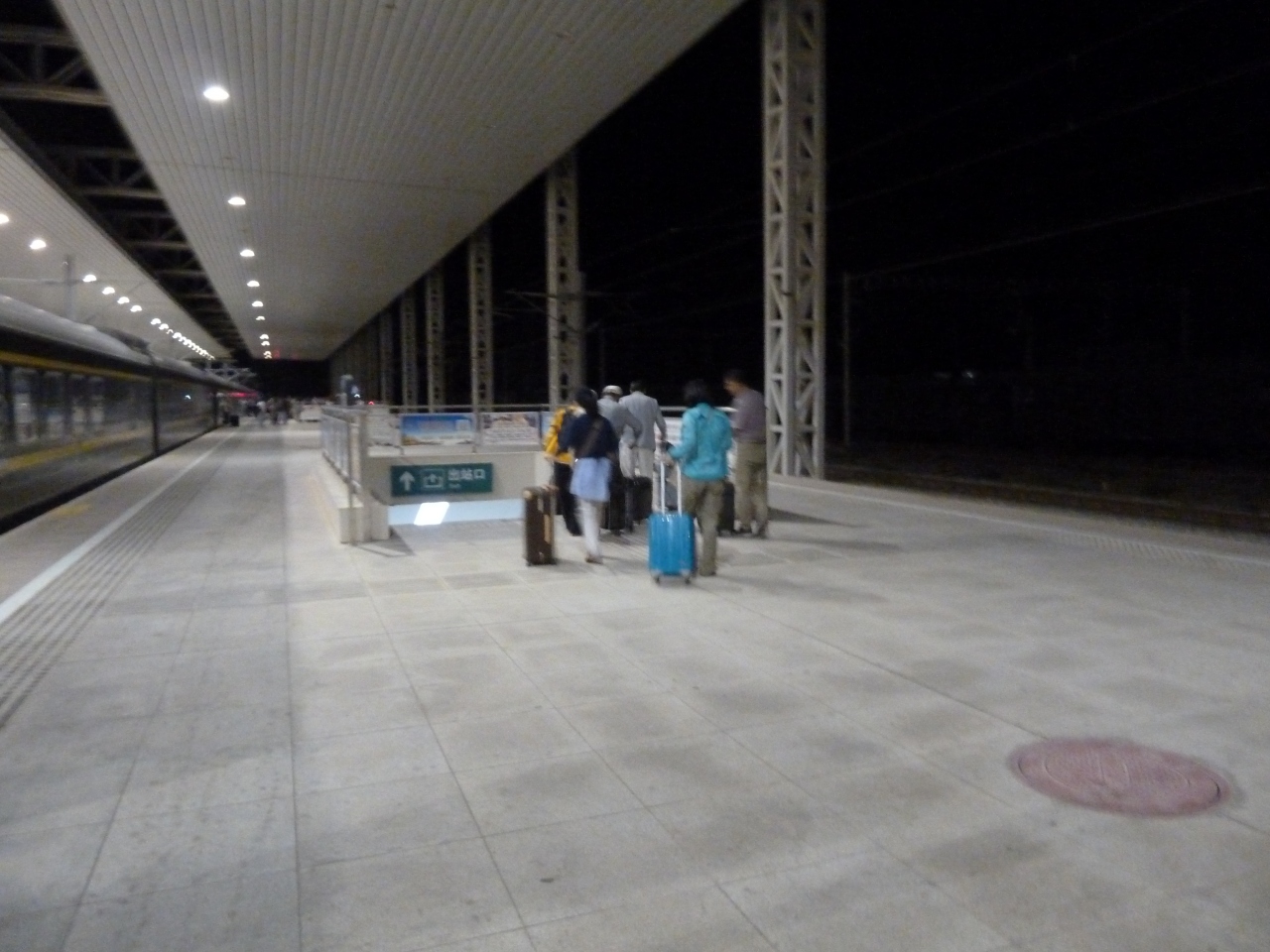 朝方、敦煌駅に着きました。列車から降りて、改札口へ向かうと下り階段だったので良かったと思ったら、登り階段があって、大きな荷物を持っている身にはつらい状況でした。改札外は、真っ暗でどのような状況になっているのかわかりませんでした。