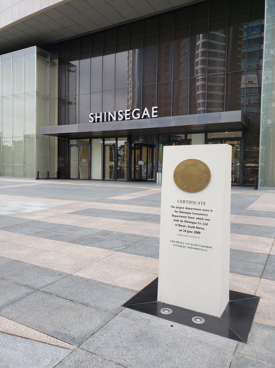 釜山のセンタムシティにある新世界百貨店はギネスに載るほど広いそうです。時間がなく、ゆっくりみることは出来ませんでしたが、駅から直結していて立地もよく、何でも揃うと思います。催事で服を買いましたが、かなり気に入りソウルでも同じ店を探しています。