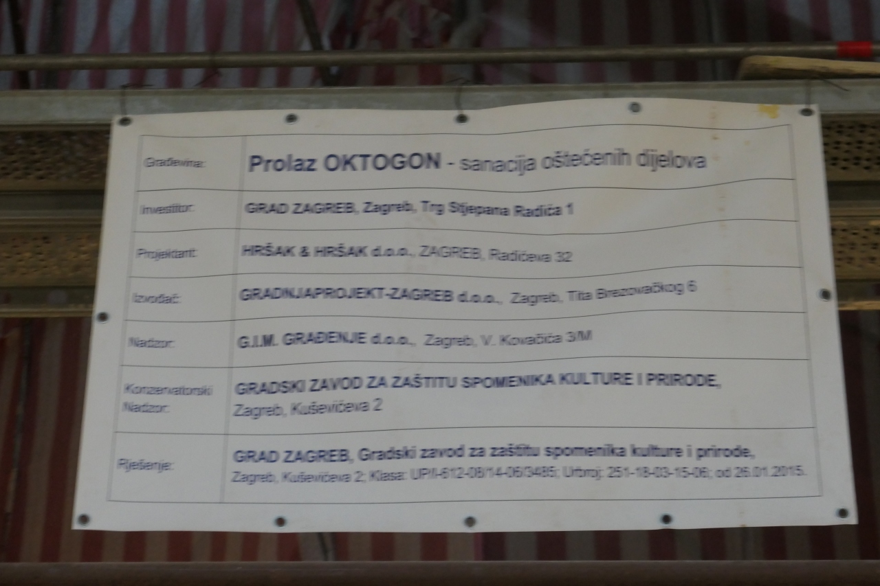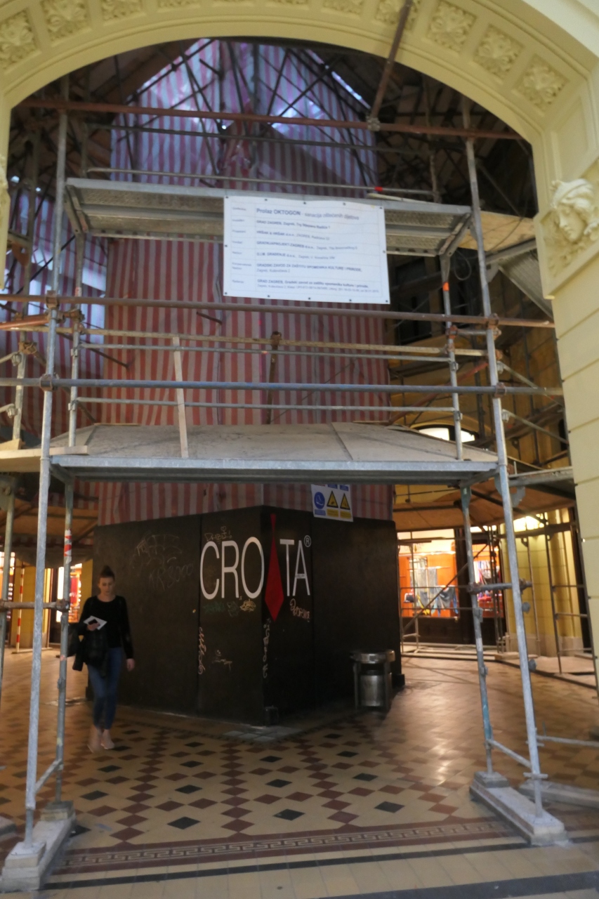 ザグレブのメンストリートであるイリツァ通り南の繁華街ビルにオクタゴンがありますので、行ってみました。オクタゴンは「八角形」の意味で、文字通り八角形の見事な建物があるはずです。入口が分かりにくかったけど、ショップが並ぶビルの通路を進み、オクタゴンの場所まで到達しました。しかし、肝心の箇所では補修工事が進行中で、シートカバーで覆われ、天井ドームは見えません。クロアチア語の表示に何やら説明がありましたが、クロアチア語が分かりませんので理解不能です。改修工事は当分の間継続されるようです。