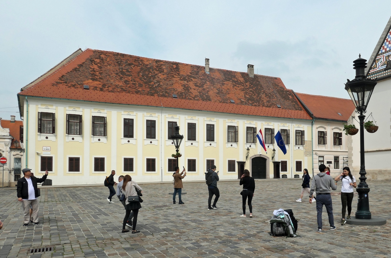 聖マルコ教会広場では、教会の右側にクロアチア国会議事堂、左側にバンスキドバリがありました。バンスキドバリは赤瓦屋根の2階建て建物ですが、聖マルコ教会に比べて地味な外見で、観光客の目を引き付けてはいない印象でした。建物入口にクロアチア国旗が掲揚されているので、公的機関が利用している建物であることが分かりました。