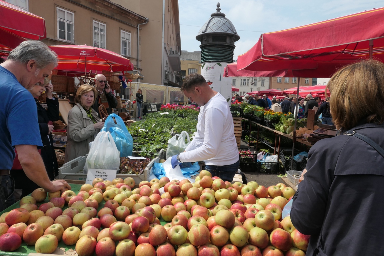 イエラチッチ広場の北側、徒歩2-3分の場所にある青空市場です。そう広く無ない広場に果物、野菜、花、そのた食材などを売るお店が沢山でていました。果物などはとても新鮮で、種類も多く、何でもある感じです。値段も日本人感覚では格安です。地元の美味しそうな果物1山が数百円の値段ですが、とても食べきれない位の分量があります。グループで観光しているのなら、購入しても良いと思いますが、個人では処分しきれません。
