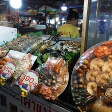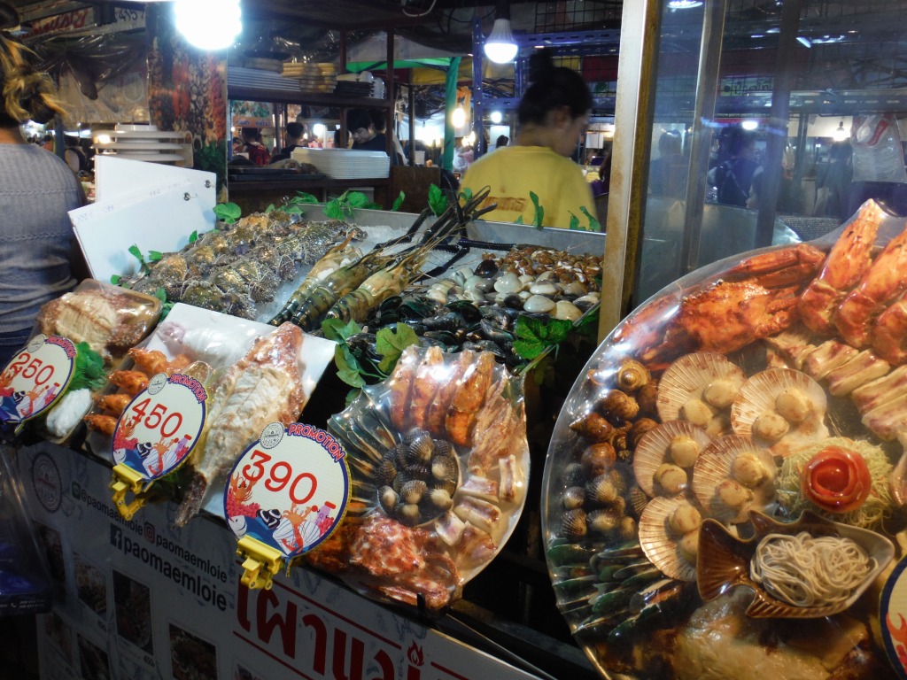 平日の午後8時ごろにアソーク駅から地下鉄(MRT)に乗って行きました。まず、有名な夜景の写真を撮るために 隣接するショッピングセンター:エスプラネードの駐車場に行きましたが、大混雑していたので写真を撮ることはあきらめました。当然マーケットも混雑していて、通路を歩くのもたいへんでしたが、楽しかったです。ここは行くたびに混雑度が増しているような気がします。