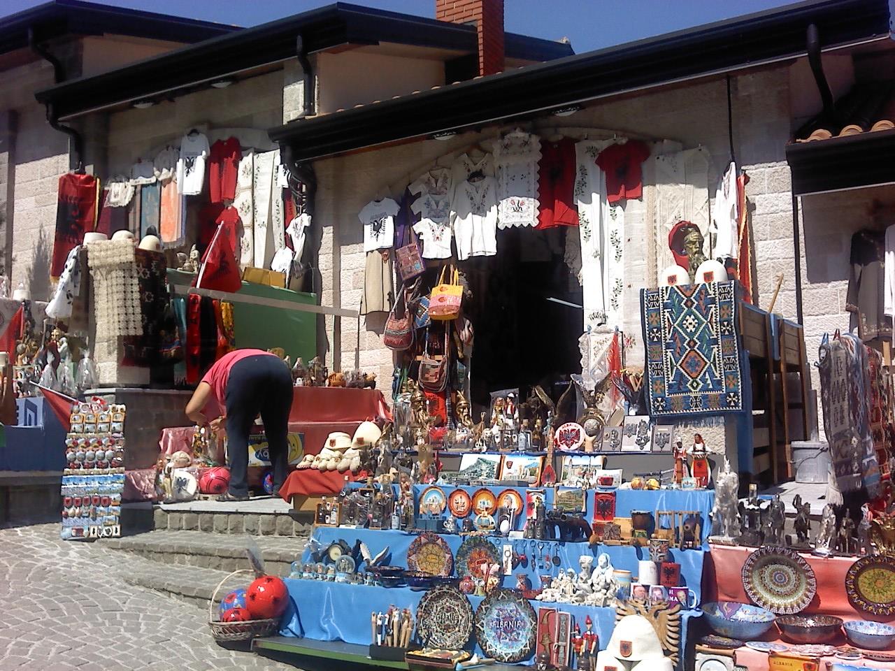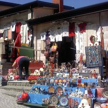 フシェクルヤからミニバンのバスに乗ってクルヤに着き、クルヤ城に行くと途中にあるお土産街です。赤や青、黄色などの織物がとてもあざやかで、にぎやかな場所です。歩いているだけでも楽しいです。ただ、物価が安いアルバニアにあっては、割高な値段設定でした。