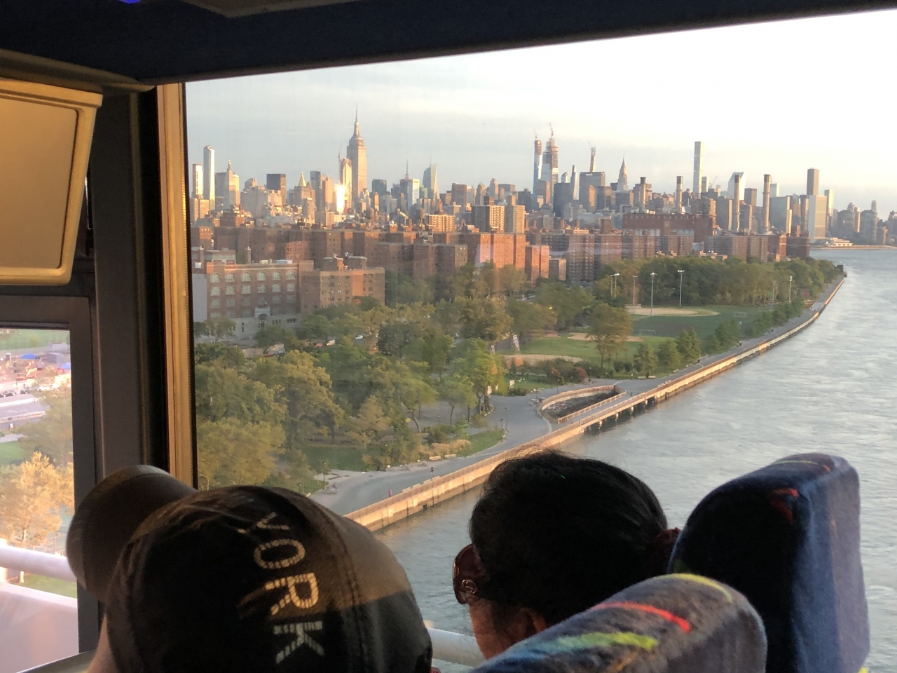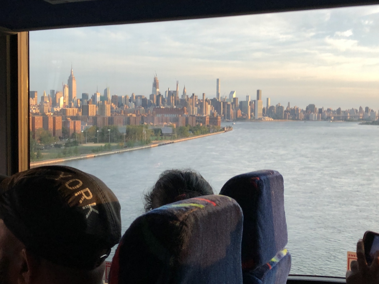 イーストリバーの中ほどを過ぎると朝日に照らされた、マンハッタンのビル群が