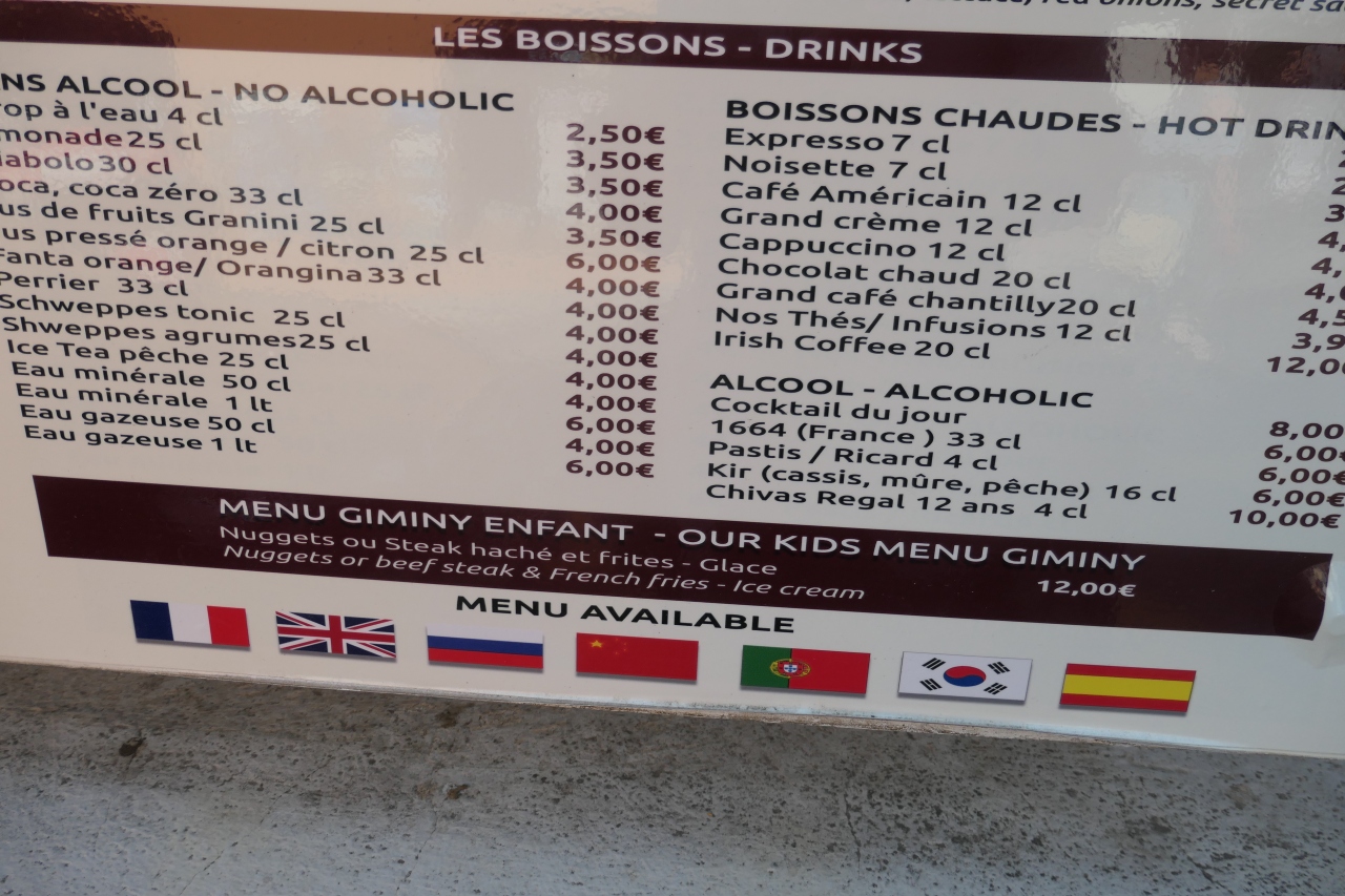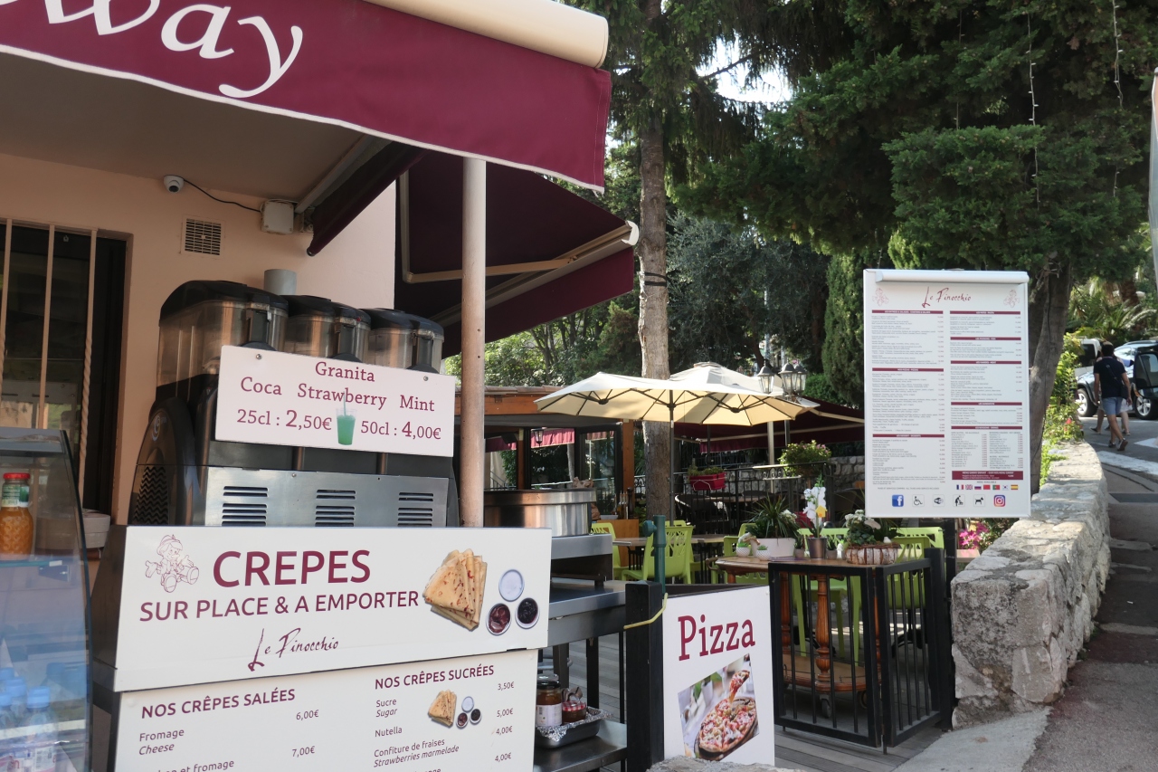 エズ旧市街は小山斜面にあるので、見学では駐車場やバス停から数十メートルの高さの急斜面を上り下りしました。暑い中ですので、村見学の後は喉も乾きました。村から下って車が出入りする駐車場手前にくると、道路脇にレストランがありました。ル ピノッキオです。小山を登ったあとで小休憩するのにピッタリな場所にあるレストランです。メニューの飲み物類価格は2-6ユーロですので、まあ妥当です。メニュー下部の国旗に中国と韓国がありますが、日本が無かったので、チョッピリ気になりました。冷たいコーラとオレンジジュースを頂きましたが味もサービスも普通でした。良い場所にあるレストランだと思います。
