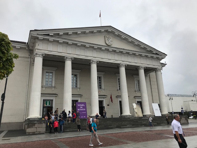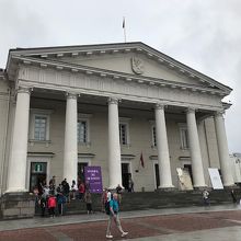 ヴィリニュスの旧市街の入口の夜明けの門をくぐると右手に聖テレサ教会、ピンクの聖霊教会、聖三位一体教会と北上して行き、この旧市庁舎 に辿り着きました。それまでは旧市街の細い道でしたが、急に視界がひらけてこの旧市庁舎 が現れました。正面にギリシャ風の柱が建っていたのが印象的です。