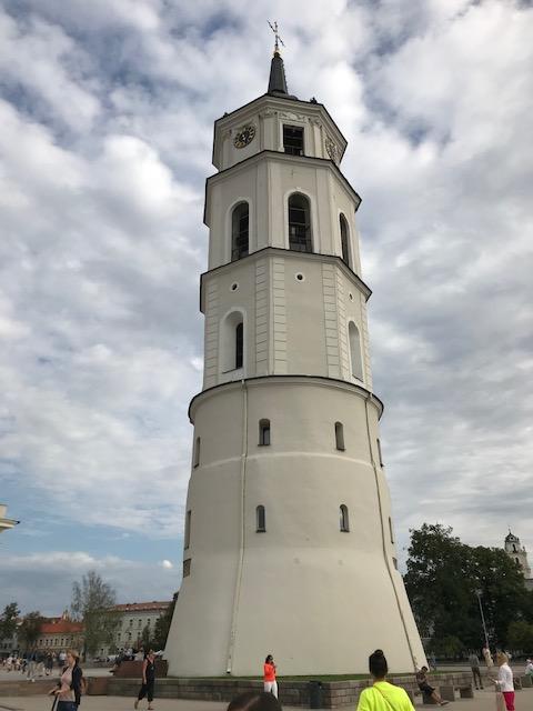 ビリニュス観光で宿泊したノボテル ビリニュス ホテルの目の前のゲディミノ大通りを進んでいくと、まずはこの鐘楼が見えてきました。真っ白な鐘楼で遠くからでもその美しい姿に感激しました、こんな美しい鐘楼は初めてです。お金を払えば登れるようですが、それはやめました。近くの地面にはThe Stebuklasというバルト3国がソ連から独立するきっかけとなった人間の鎖の出発点のタイルもあります。