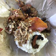 サヌールのバイパス沿いにあるバビグリンのお店です。観光客はぼったくられると聞いたのでチャーターしたタクシーの運転手さんに買ってきてもらい部屋で食べました。一つ25000ルピアでした。サンバルが効いてとにかくスパイシー、辛いもの好きにはいいけど、苦手な人は食べられないと思います。