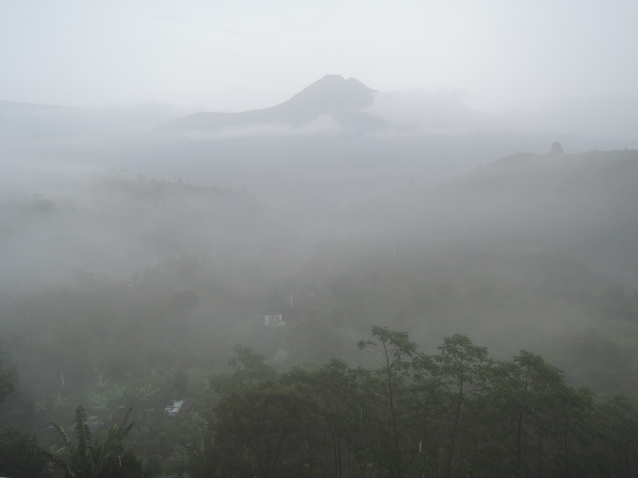 眺めの良いテラス席に最初は座ったのですが、店の中に移動。食事が終わるころやっと小降りになってきましたが、バトゥール山が少し見えてきただけ。墨絵の世界のような景色で、残念でした。