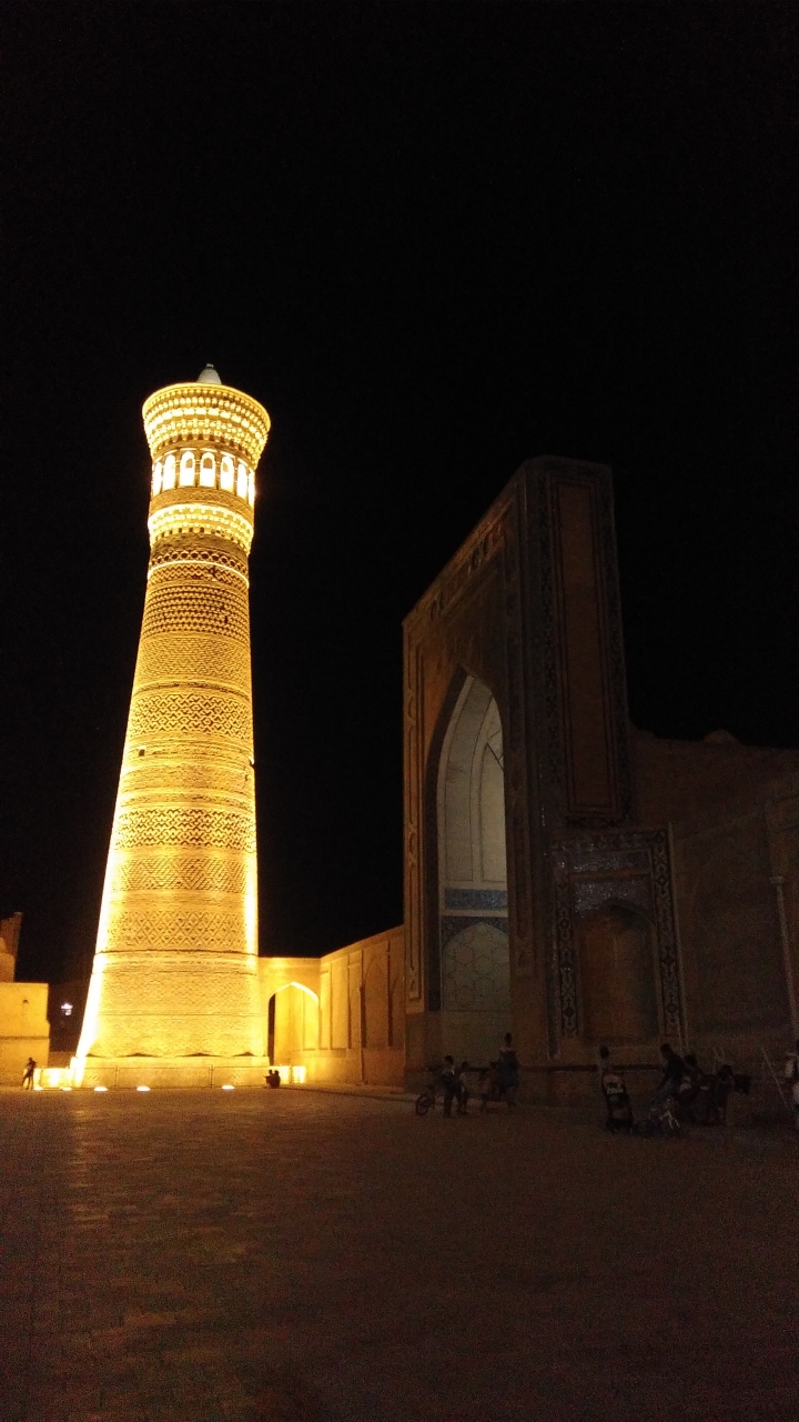ブハラの街からはどこからでも見ることができます。カラーン・ミナレットのちかっくにメドレセがあります。しかも二つも。向き合って。カラーンミナレットの近くにある通りには、かのチンギスハンも歩いたことがあるのだとか。旅をしていると地球の大きさや歴史の素晴らしさを感じることができます。また、夜になると、カラーン・ミナレットの堀に合わせてライトが埋め込まれているのできれいに見えます。