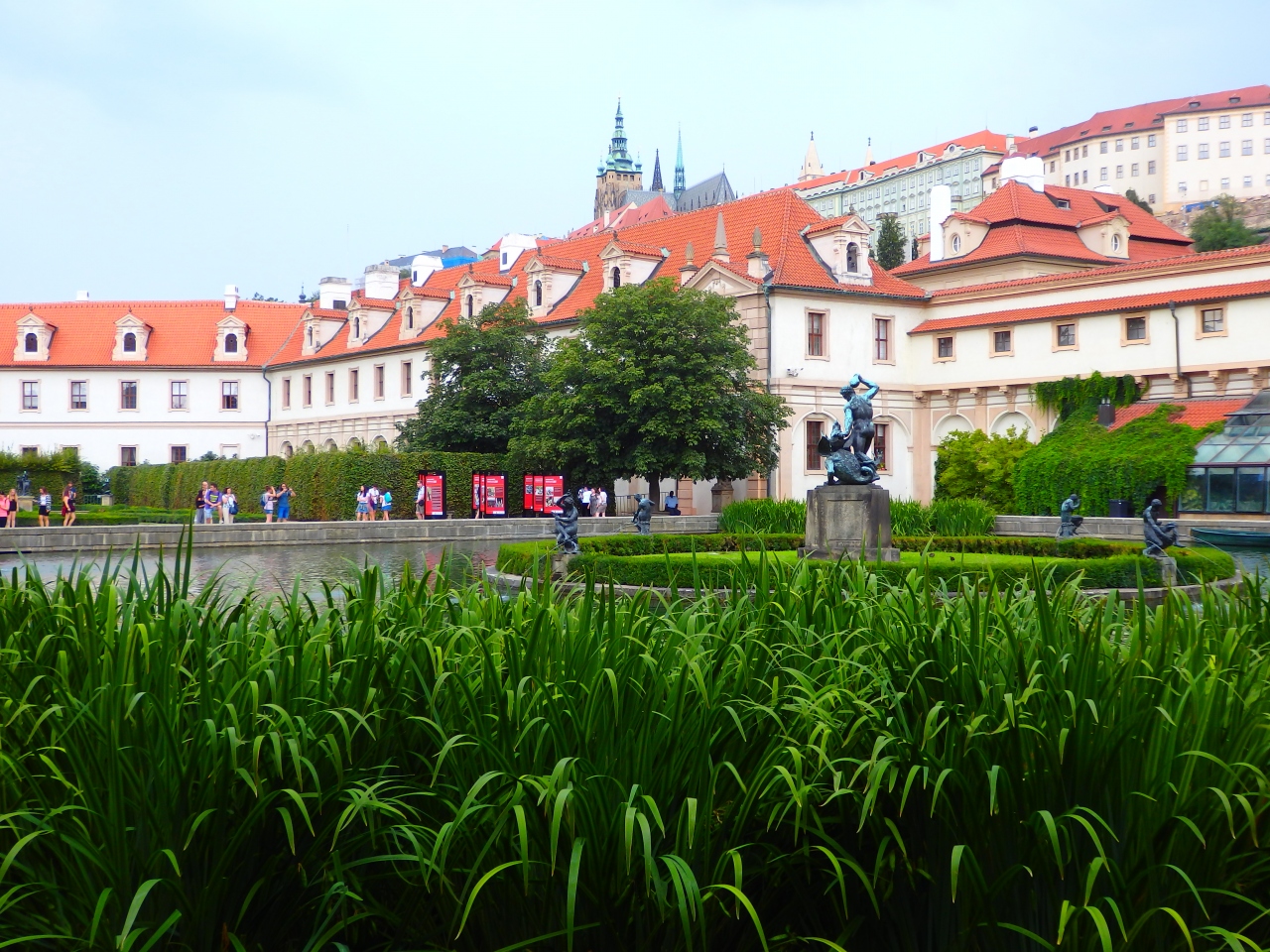 入口から少し進むと広い池と庭園、その奥の建物の上部にプラハ城が優雅に見えます。