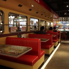インスタ映えスポットとして有名で、店内はバスっぽいつくりと学校っぽい演出が混ざっています。タイル貼りの床、真っ赤なビニールシート、漢字の看板などレトロな雰囲気を出しながらも、どこかポップに仕上げています。