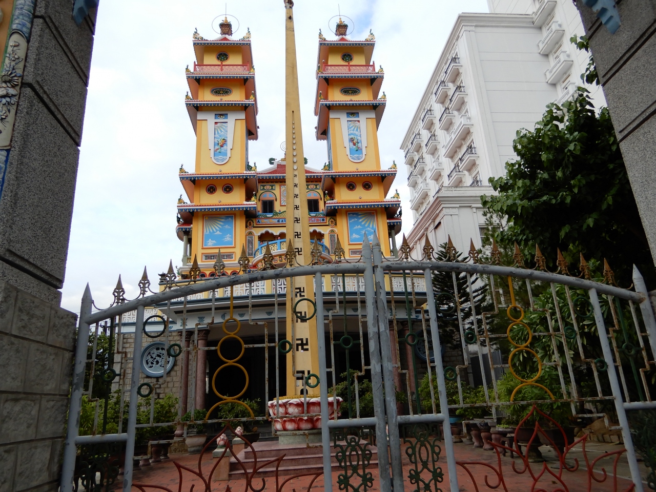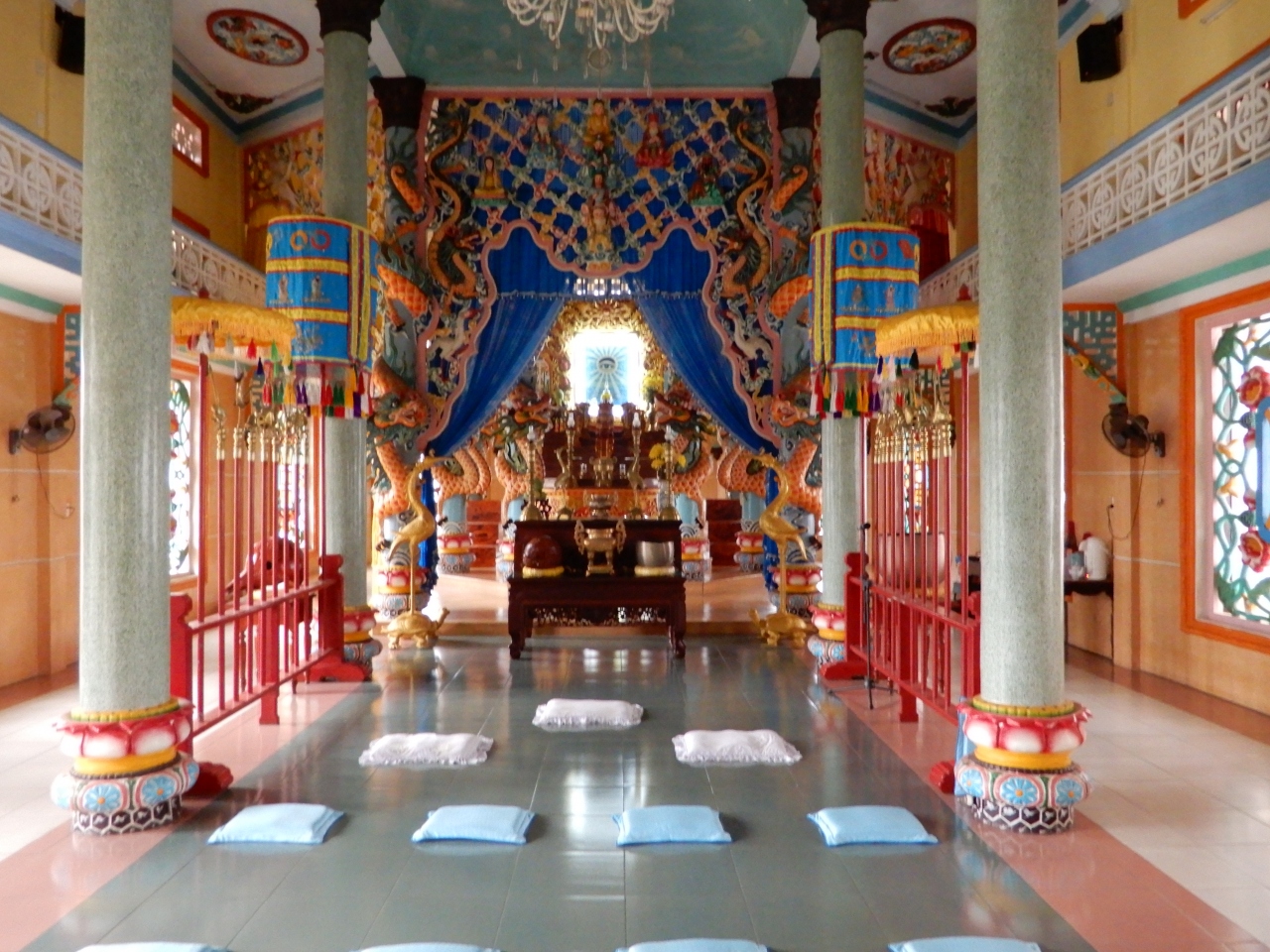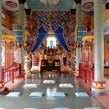 ホイアンで行き損なったベトナムの新興宗教であるカオダイ教の寺院。どうしても見たくてフエのこの寺院をとことこと市内を歩いて見に行きました。礼拝時間でなかったためか大通り側の正門は閉ざされていました。しかし、大通りの裏側にある入口に回ってみると自由に中に入れました。想像していたものよりも神秘的な建物で、屋内の拝礼所の正面に掲げられている神様の姿である大きな目は強烈なインパクトでした。